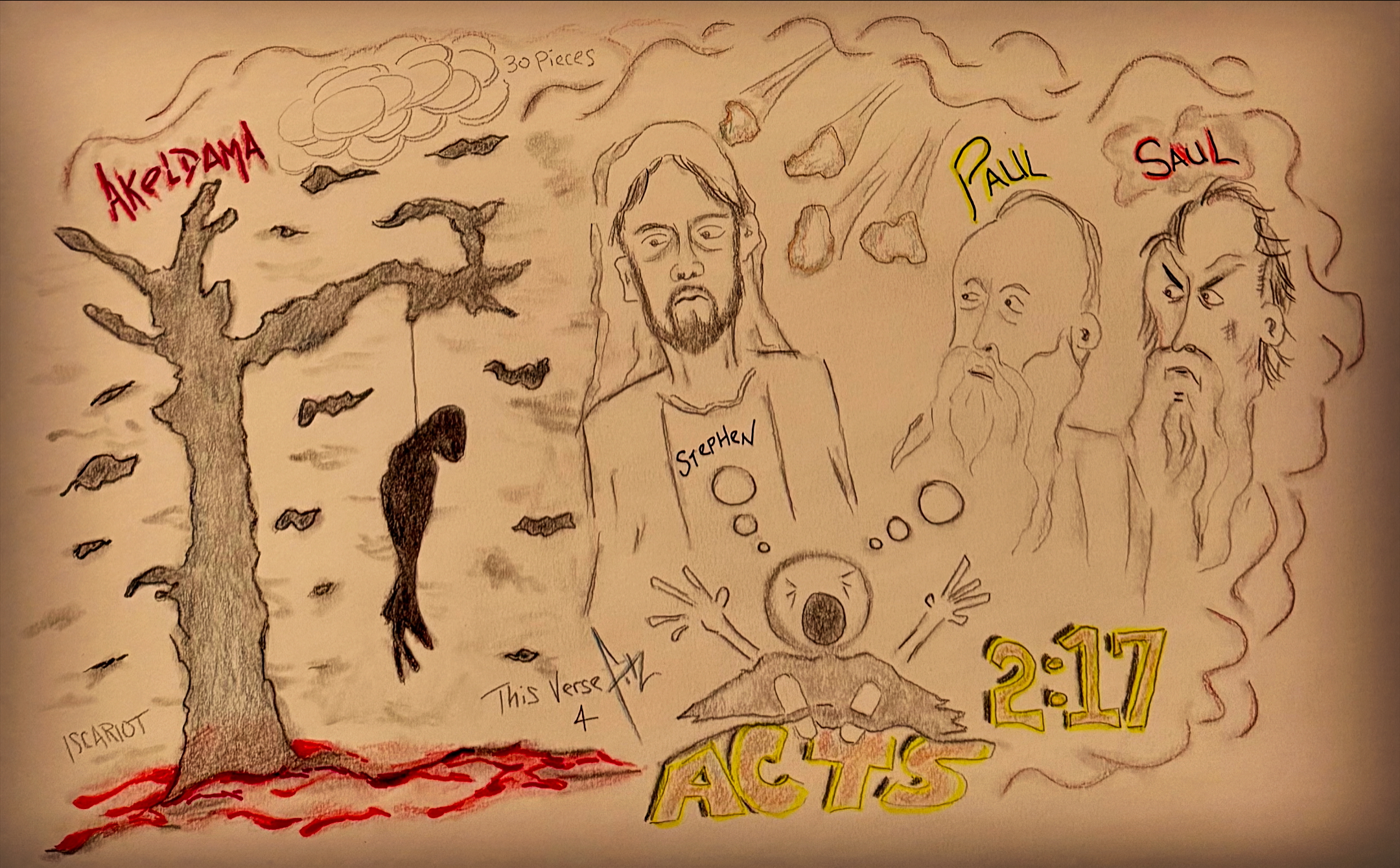 Acts 1 is an introduction and mentions each Apostle. It has a short mention of Judas Iscariot who betrayed Jesus. Acts 1:16 – 19 “Judas, who became a guide to those who arrested Jesus. For he was numbered among us and was allotted his share in this ministry (Now this man acquired a field with the reward of his wickedness, and falling headlong he burst in the middle and all his bowels gushed out. And it became known to all the inhabitants of Jerusalem, so that the field was called in their own language Akeldama, that is, (Field of Blood).”