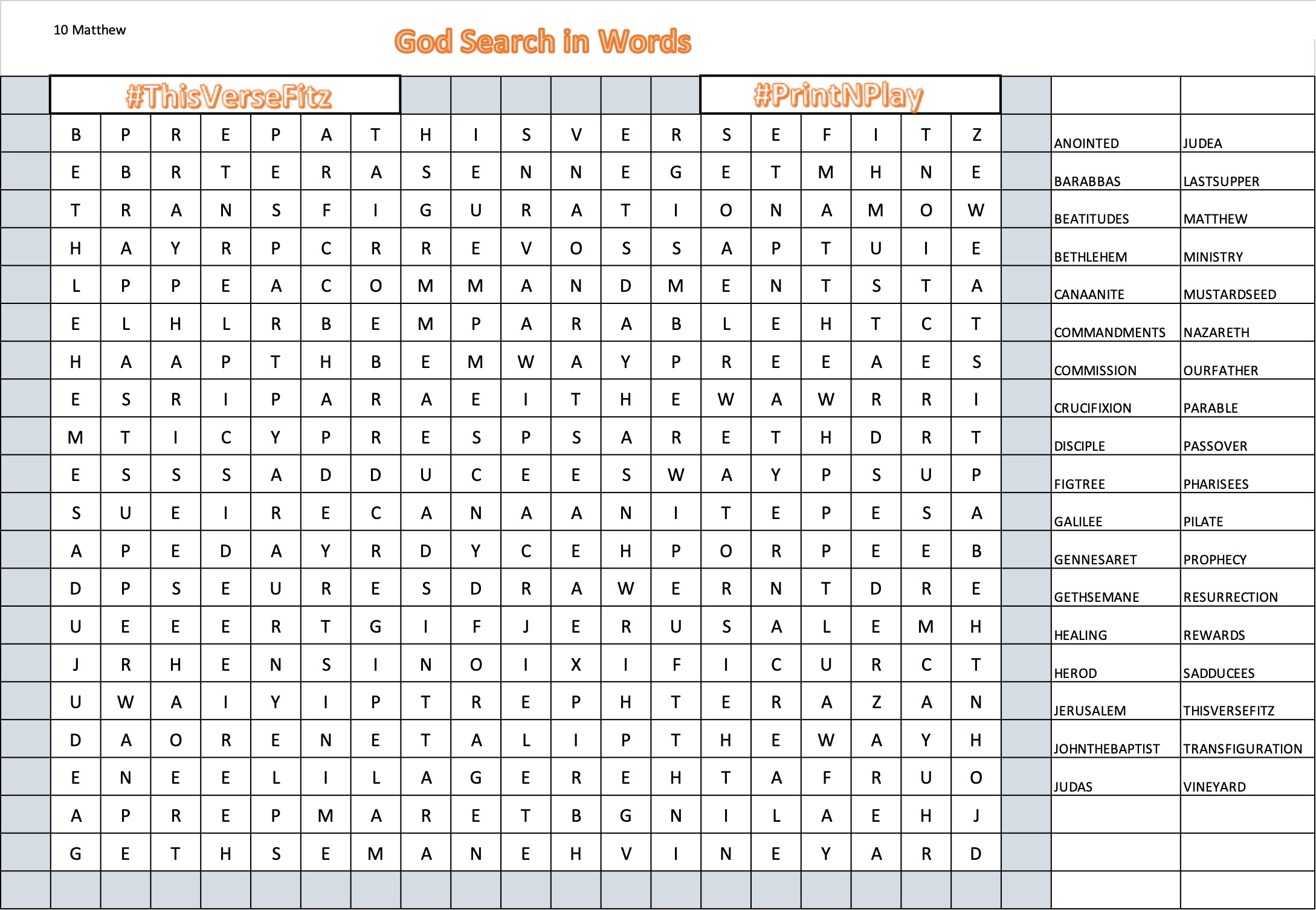 “God Search in Words” works exactly as a normal “Word Search” with a somewhat higher level of difficulty given the Biblical terms. Once all the words are found, the leftover letters repeat a phrase 6.9 times (meaning the phrase is present 6 times and 9 letters of the phrase are left over). We call this the “AfterPuzzle”